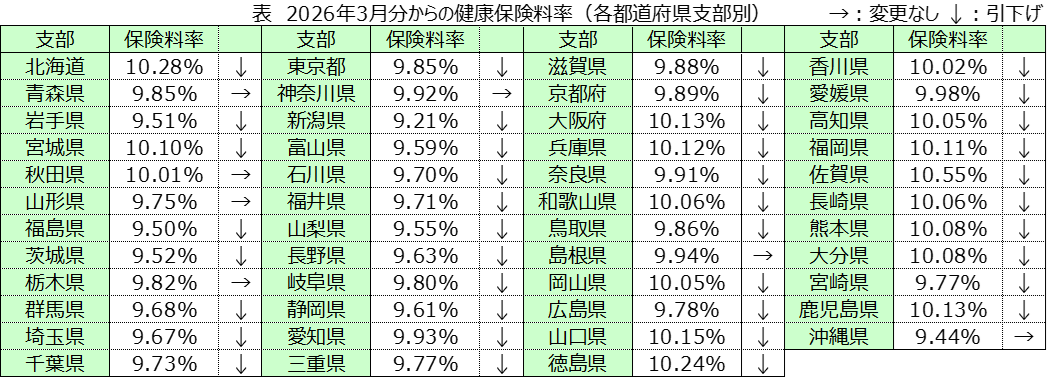 協会けんぽの健康保険料率は、都道府県支部別に設定されます。2026年3月分から適用される健康保険料率は下表のとおりとなりました。すべての都道府県で前年度より引下げ、または、変更なしとなりました。